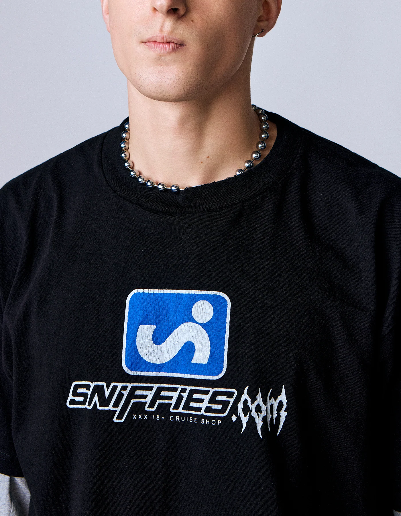 Be street ready in the Sniffies Vintage Skate Tee. A crackle print bold blue logo, accented by gothic flames lettering, and that unmistakable XXX 18+ Cruise Shop tagline, this tee is built for the ones who know where to look. The distressed collar and sleeves give it that lived-in, well worn feel, like you’ve been out, been seen, and been handled. The oversized vintage 90's fit keeps it laid-back. Wear it to the skatepark, the bar, or wherever the map takes you. They’ll know why you’re there.