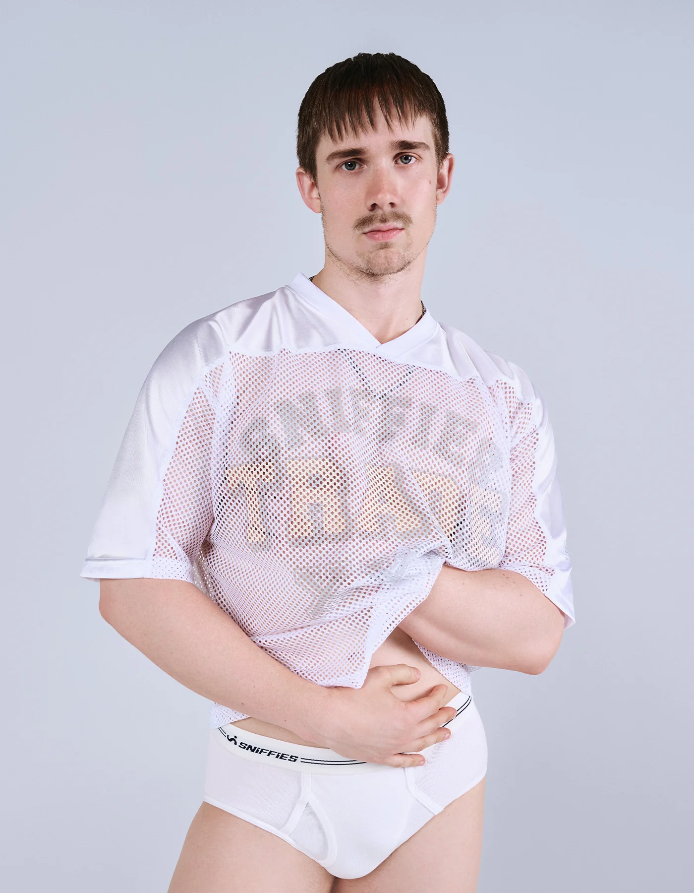 Pads off. Lights on. Trade's here to play! The Trade Football Jersey is your go-to for high-visibility cruising and low-effort flexing. With its cropped fit and full mesh body, it shows just enough while leaving the rest to imagination—or invitation. Sniffies “TRADE XXX” graphic hits bold beneath the mesh, while the oversized “8” on the back lets them know you’re game-ready. Finished with a classic v-neck and wide sleeves, this jersey breathes easy whether you’re at the function, at the gym, or just waiting to host.